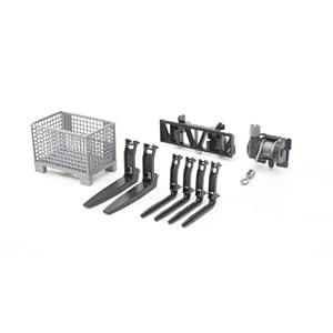 Product Description : From the ManufacturerThe front loader accessories consist of an adapter, a basket pallet, a cable winch and four hay forks plus two pallet forks. To add to the fun of playing, the front loader accessories can be fitted to all tractors of the Top Pro series and the Manitou telescopic loader (not included). Product Description : Bruder Accessories for Front Loader Box-Type Pallet Winch and Forks - Bruder 02008.