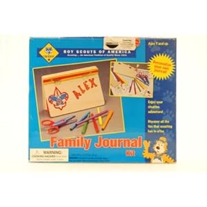Product Description : This is the Boy Scouts of America? Family Journal Kit. Suitable for Tiger Cubs Ages 7 & Older. FEATURES: Everything you need to make a nice album to keep all of your favorite memories in! Solid, natural wood album has been pre-cut, sanded and hinged to open like a tablet. Metal finishing screws holds the 20 pre-punched sheets of paper like a binder. Pre-printed design patterns are provided and can be applied in 1 of 2 ways: transfer or trim out. Non-toxic color markers. Self-adhesive Cub Scout stickers. Both a pair of straight and craft scissors are provided. Detailed instructions provided. INCLUDES: (1) Wood Album (1) Glue Stick (20) Insert Sheets (1) Sticker Sheet (6) Markers (2) Pattern Sheets (2) Pairs of Scissors Sandpaper SPECS: Album Size: 6"" x 9""