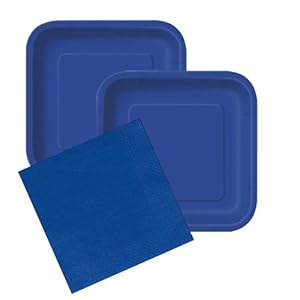 Category: Toys & Games Vendor: 3 Item Party Pack 30 ct - blue dinner plates - measures 9" - square shaped 40 ct - blue dessert plates 75 ct blue lunch napkins Product Description : Blue Party supplies for up to 70 guests - Mix n match with other colors and patterns to customize your celebration.